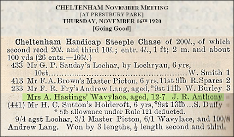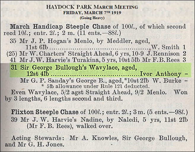 WAVYLACE RAN TEN RACES IN 1919 AGED TEN.Sir George Bullough was one of six Stewards of the National Hunt Committee